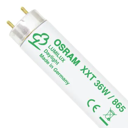 The Osram T8 L 36W/865 XXT G13 Daylight are florescent tubes endowed with a 36W power output and with a G13 socket. These tubes measure 120cm in length. Their incredibly long life span is of 80.000 hours on average. Their colour rendering is set between 80Ra and 89Ra. These tubes present a colour temperature of 6500K: this indicates that they can produce the so called "daylight" effect, similar to the mid day sun light.